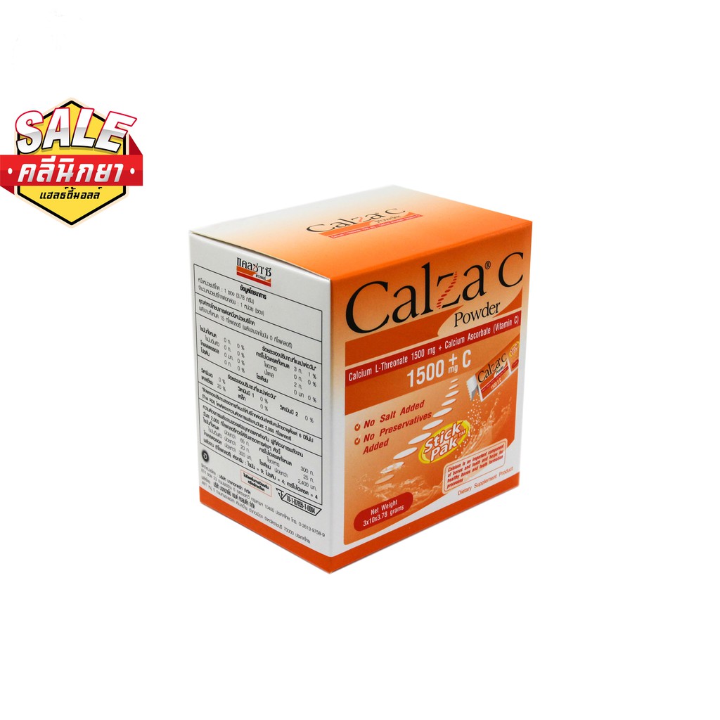 Calza-c 1500mg pantip-Calcium carbonate 1250 MGVitamin D3 250 IU Therapeutic Class Vitamins, Calcium Preparations Country of origin INDIA 15 Units/pack Category C Animal reproduction studies have shown an adverse effect on the fetus and there are no adequate and wellcontrolled studies in humans, but potential benefits may warrant use of the drug inCalcium Lthreonate 1500 mg Vitamin C (Calcium Ascorbate) 60 mg ผลิตภัณฑ์เสริมอาหาร แคลเซียมแอลทรีโอเนต ผสมวิตามินซี ใช้ชงละลายน้ำแค่วันละซอง CALZA C 1500MG POWDER 30'S (CALCIUM LTHEONATE